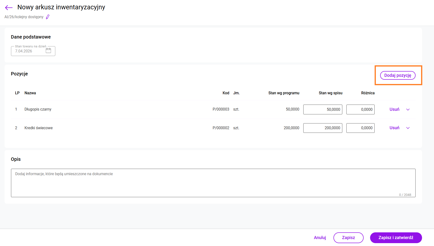 Pojawi się arkusz z uzupełnionymi już danymi. Użytkownik ma możliwość edycji kolumn: Stan wg spisu, Różnica oraz Opis.