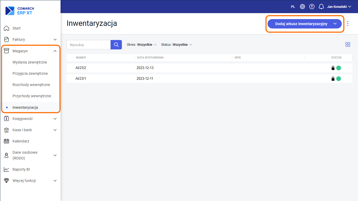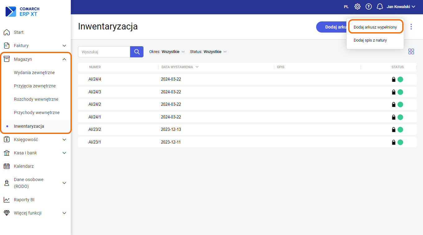 Możliwość inwentaryzacji jest dostępna w pakiecie „Magazyn„. Pierwsza opcja to dodanie pustego arkusza inwentaryzacyjnego, w którym będziemy ręcznie uzupełniać stan naszych towarów. Druga – to dodanie wypełnionego już przez program arkusza.