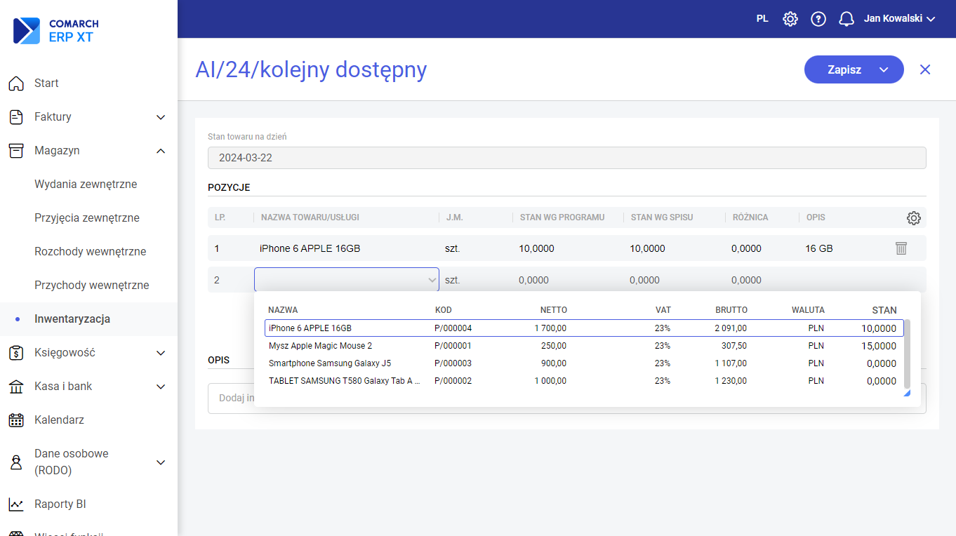 Krok drugi – pojawi się nam arkusz z uzupełnionymi już danymi. Użytkownik ma możliwość edycji kolumn: „Stan wg spisu”, „Różnica” oraz „Opis”. Po naniesieniu zmian możemy zapisać lub zatwierdzić arkusz.