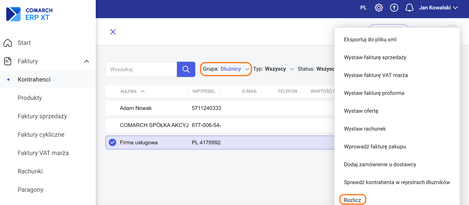 W celu rozliczenia kontrahenta wybieramy: Faktury >> Kontrahenci. Ustawiamy filtr inny niż „Wszyscy” przy czym z listy zawężonej do dłużników rozliczane są należności, a z listy wierzycieli – zobowiązania. Zaznaczamy teraz kartę kontrahenta, którego chcemy rozliczyć i z menu pod trzema kropeczkami wybieramy opcję: „Rozlicz”.
