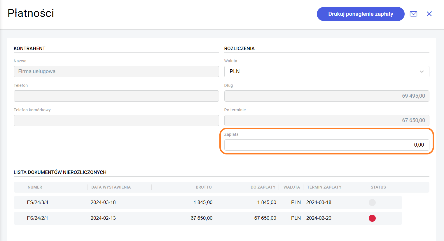Po ustaleniu kwoty rozliczenia klikamy Zapisz w prawym górnym rogu. Zaznaczone dokumenty zostaną rozliczone w całości lub częściowo w zależności od wartości zapłaty. Jeżeli wartość ta jest za mała aby rozliczyć wszystkie dokumenty, zostaną one rozliczone w kolejności chronologicznej.