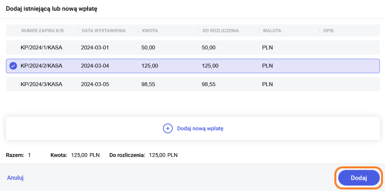 Jeżeli płatność dotyczy dokumentu zatwierdzonego na stałe (posiada symbol zamkniętej kłódki), to po wybraniu Dodaj rozliczenie wyświetli się lista nierozliczonych zapisów kasowych/bankowych, które można wykorzystać do rozliczenia płatności. Na liście jest widoczne podsumowanie uwzględniające kwoty zaznaczonych zapisów. W tym celu można wykorzystać jeden lub więcej zapisów. Wystarczy zaznaczyć wybrane zapisy na liście i wybrać Dodaj. Zapisy zostaną powiązane z płatnością i rozliczone w całości lub częściowo w zależności od ilości środków dostępnych na zapisie.