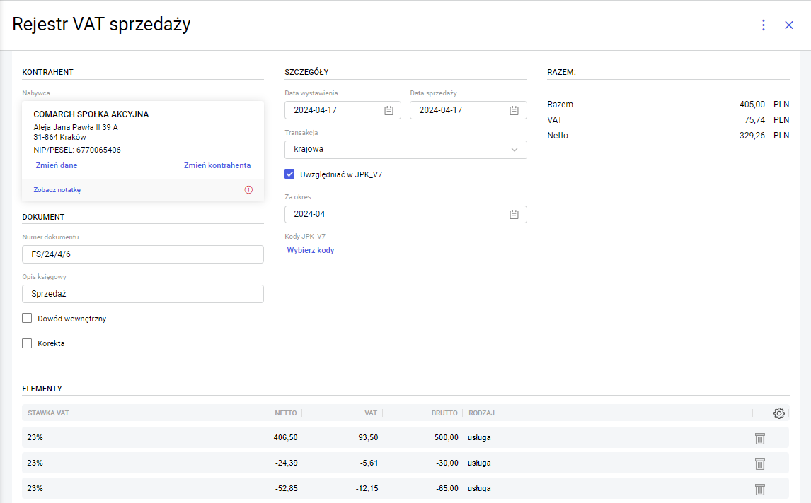 Na zapisie w rejestrze VAT sprzedaży w sekcji RAZEM widoczna kwota to wartość faktury finalnej pomniejszona o wcześniej wpłacone zaliczki. W sekcji ELEMENTY w pierwszym wierszu prezentowana jest suma wartości zaliczek i faktury finalnej. W kolejnych wierszach odejmowane są wartości wpłaconych zaliczek, przy czym każda faktura zaliczkowa jest prezentowana w osobnym wierszu.