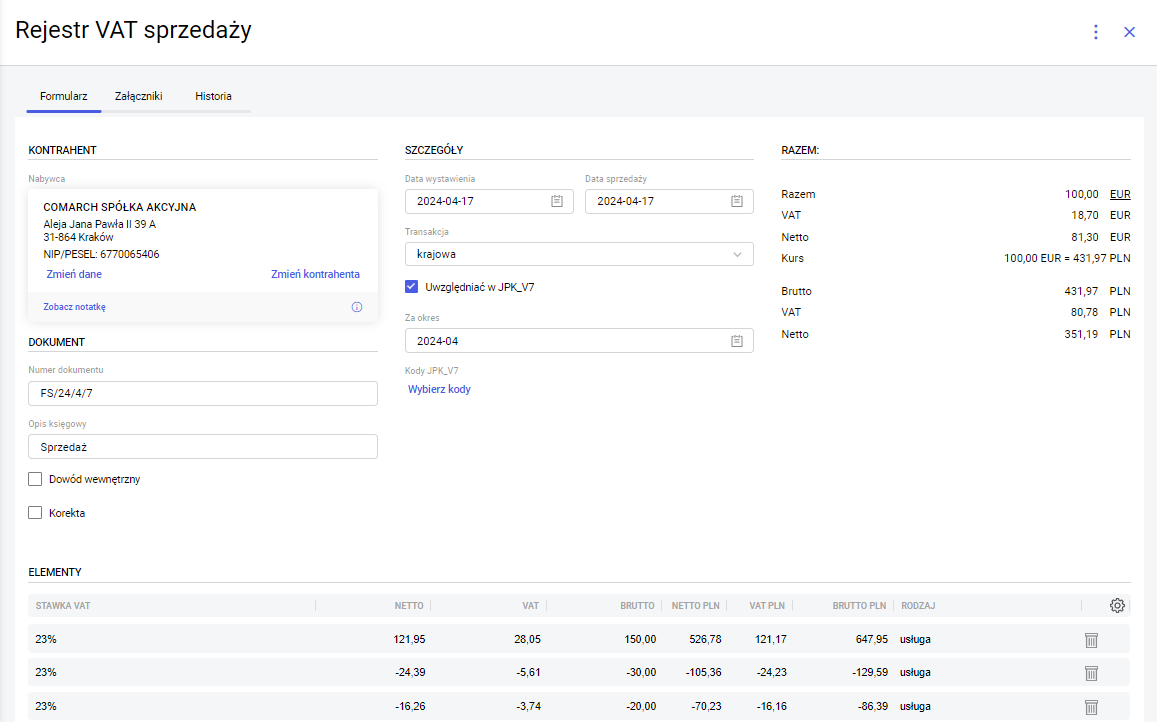 Na zapisie rejestru VAT sprzedaży do faktury finalnej w walucie obcej prezentowane są wartości w PLN oraz w walucie obcej. W sekcji RAZEM wartość faktury finalnej pomniejszona jest o zaliczki w walucie PLN oraz w walucie obcej. W sekcji ELEMENTY pojawią się dodatkowe kolumny: Netto PLN, VAT PLN oraz Brutto PLN.