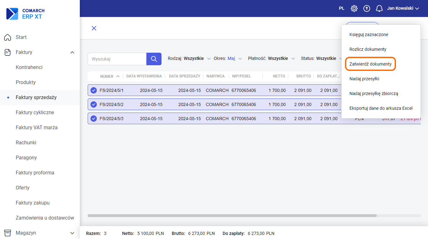Aby seryjnie zatwierdzić dokumenty z poziomu listy, należy zaznaczyć prawym przyciskiem myszy wszystkie dokumenty które chcemy zatwierdzić, a następnie z menu pod 3 kropkami należy wybrać opcję „Zatwierdź dokumenty”