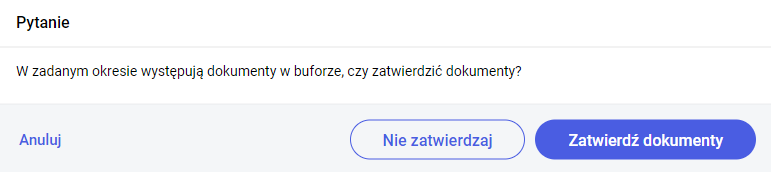 Podczas tworzenia pliku JPK_FA oraz wysyłki dokumentów za pomocą Internetowej Wymiany Dokumentów wybieramy zakres dat. Jeżeli w tym okresie występują dokumenty nie zatwierdzone na stałe, pojawi się komunikat z pytaniem czy takie dokumenty zatwierdzić. Kliknięcie „Tak” rozpocznie proces zatwierdzania wszystkich niezatwierdzonych dokumentów z danego okresu.