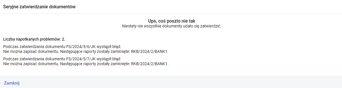 Jeżeli z jakiegoś powodu dokument nie może zostać zatwierdzony, program wyświetli informację o numerze dokumentu i powodzie dla którego nie został zatwierdzony.
