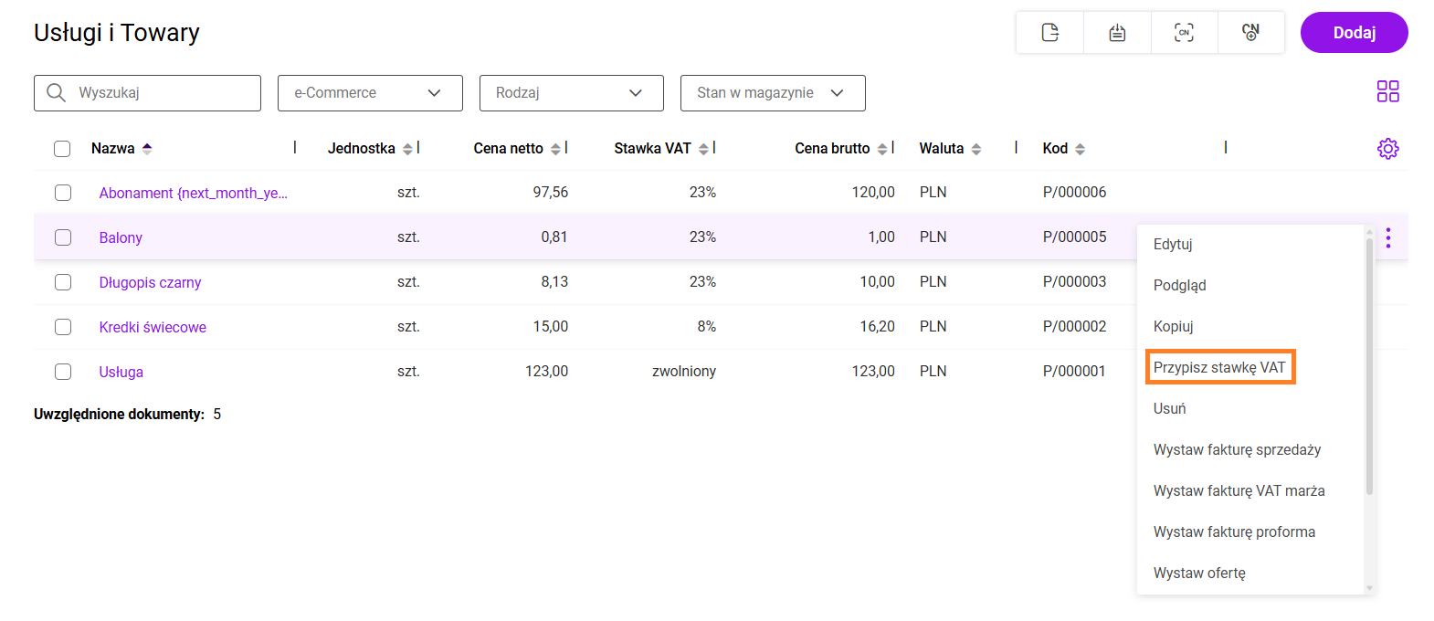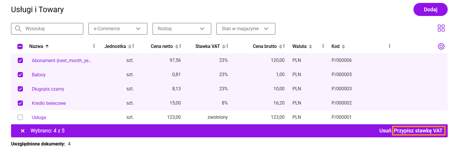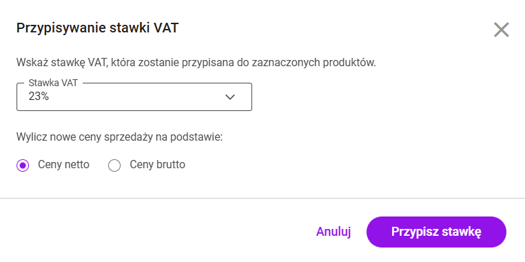 - stawka VAT zostanie przypisana do wybranych produktów
