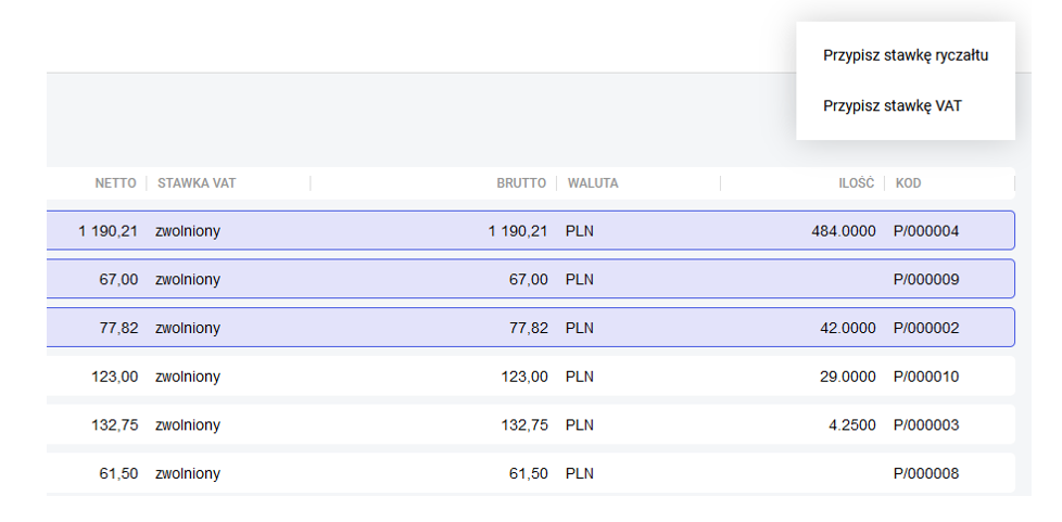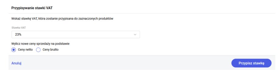 Przypisanie lub zmiana stawki VAT możliwe jest z poziomu listy produktów. Po zaznaczeniu jednej lub kilku pozycji, w menu kontekstowym dostępna jest opcja: Przypisz stawkę VAT.