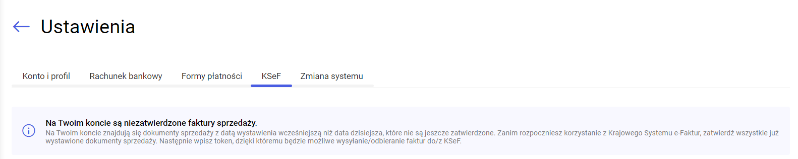 Wpisanie tokena KSeF jest zablokowane również w sytuacji, gdy na koncie istnieją dokumenty niezatwierdzone z datą wcześniejszą niż data konfigurowania integracji. W konfiguracji pojawi się wtedy odpowiedni komunikat: