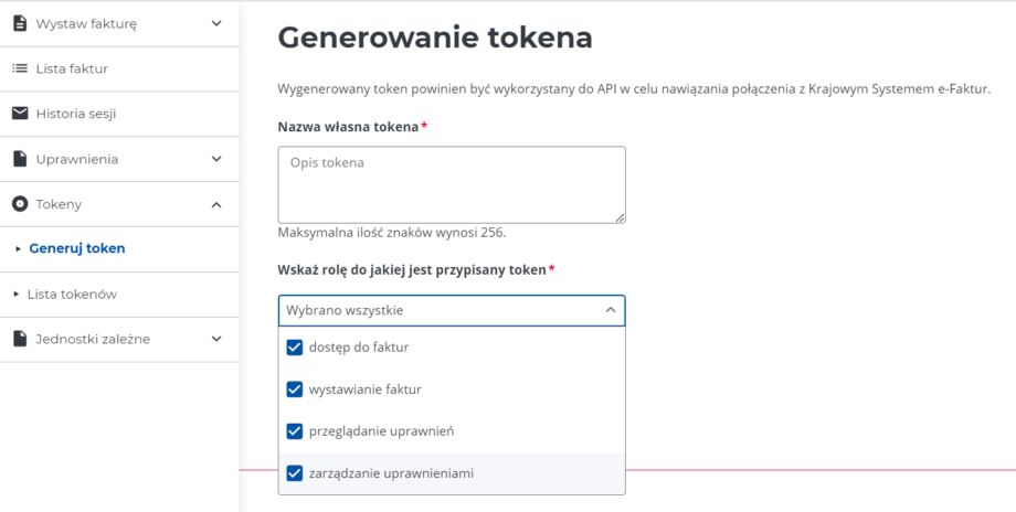 Token to 40-znakowy kod służący do uwierzytelniania użytkownika podczas wymiany danych. Token należy wygenerować bezpośrednio na platformie KSeF, z poziomu zakładki Tokeny > Generuj token: