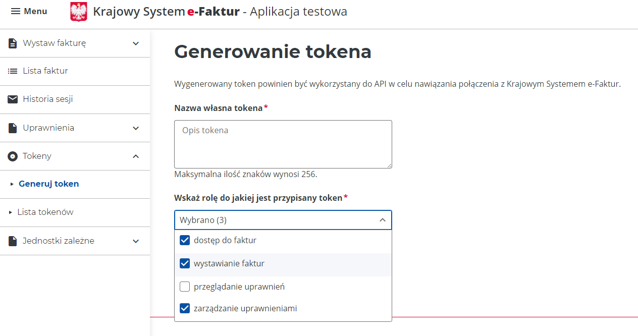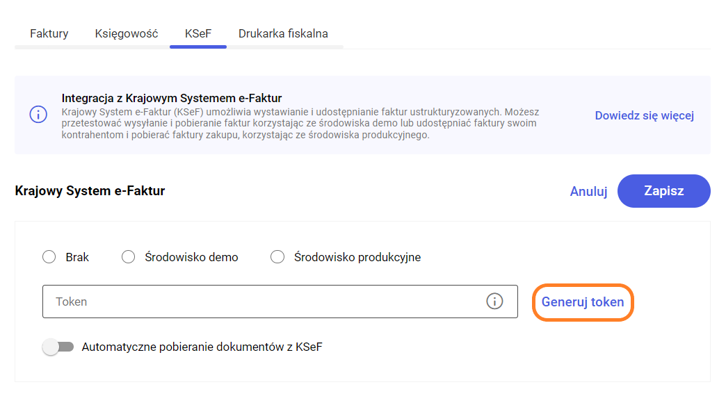 Po wybraniu środowiska KSeF należy wygenerować odpowiedni token służący do wymiany danych. Token to kod służący do uwierzytelniania użytkownika podczas wymiany danych.