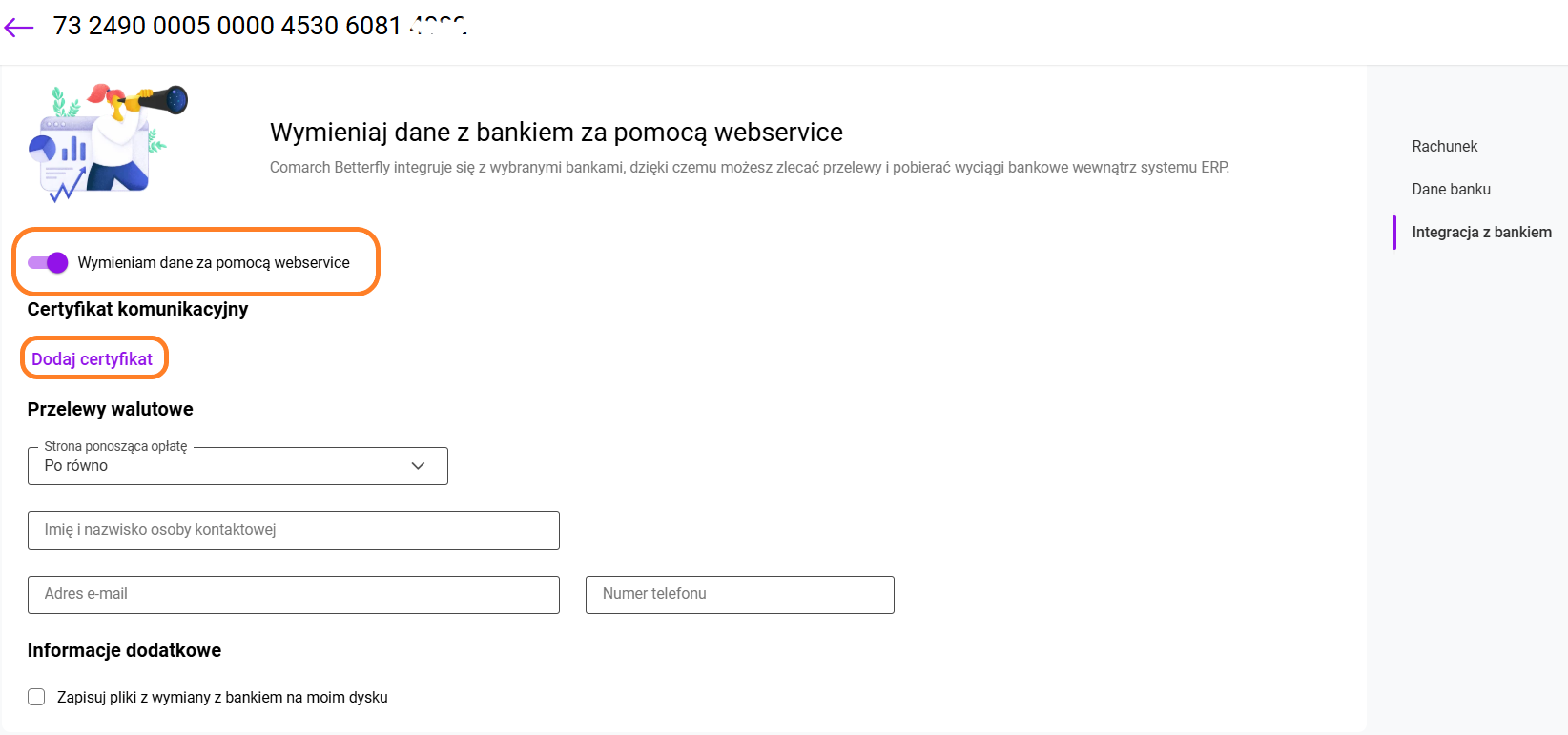 Nie będzie możliwości zapisania formularza rachunku bankowego z zaznaczonym parametrem Wymiana danych za pomocą webservice bez podpiętego certyfikatu komunikacyjnego.