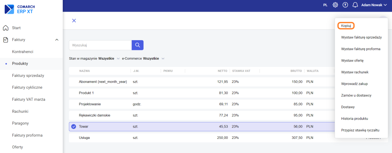 Opcja kopiowania jest dostępna po zaznaczeniu karty jednego z produktów na liście i z menu wybraniu opcji „Kopiuj”.