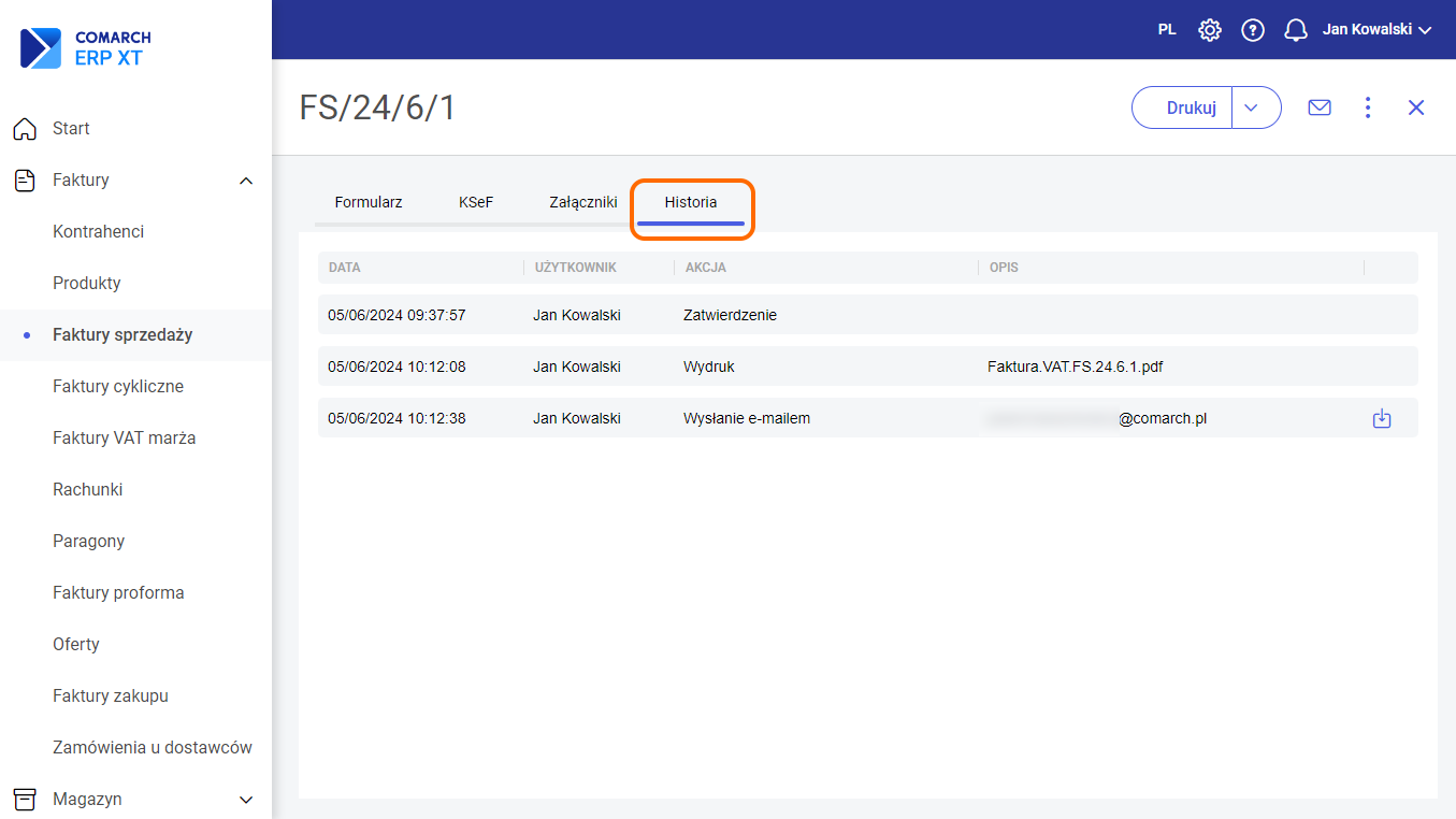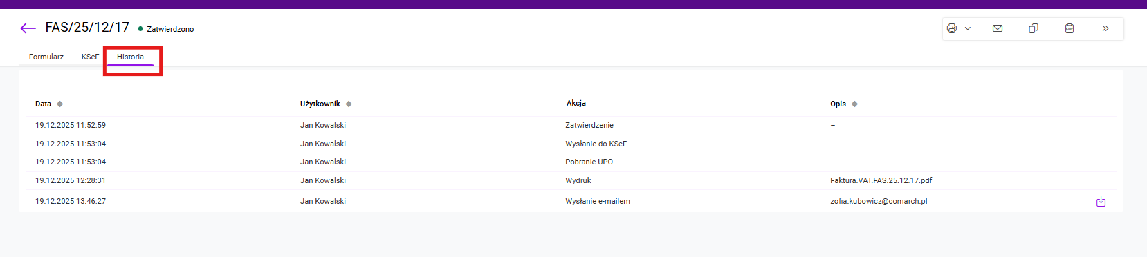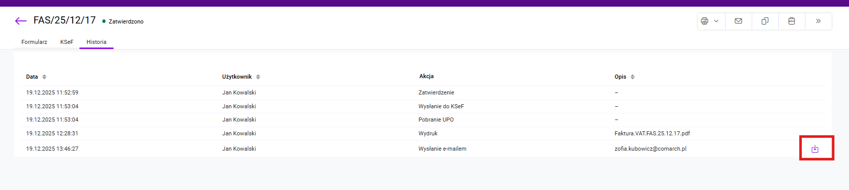 Zakładka ta zawiera tabelę, w której umieszczone są informacje o tym kto i kiedy wykonał określoną akcję na dokumencie. W przypadku wysyłki mailem zapamiętywany jest także adres, na który został wysłany dokument, a także generowany jest plik pdf z wysłanym dokumentem, który użytkownik może pobrać w dowolnym momencie klikając na strzałkę w tabeli.