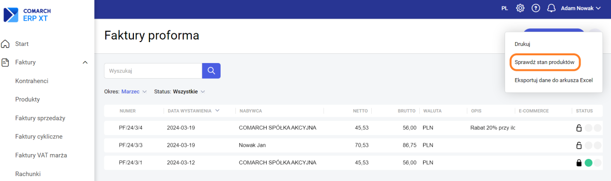 Krok pierwszy – wybieramy Faktury >>> Faktury proforma, a następnie z menu pod trzema kropeczkami opcję „Sprawdź stan produktów”.