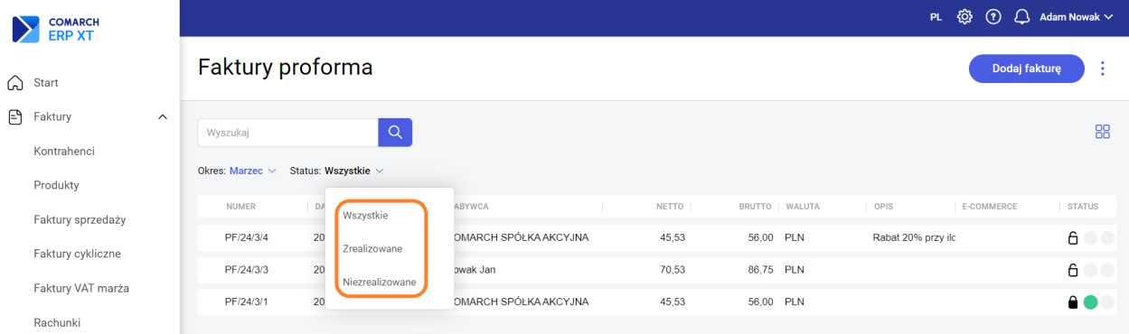 • Status: Wszystkie – faktury proforma niezrealizowane i zrealizowane,