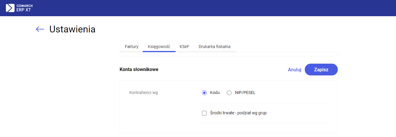 - w przypadku kontrahentów będzie to kod kontrahenta lub numer NIP/ PESEL w zależności od wybranej opcji w sekcji Konfiguracji -> Księgowość -> Konta słownikowe,
