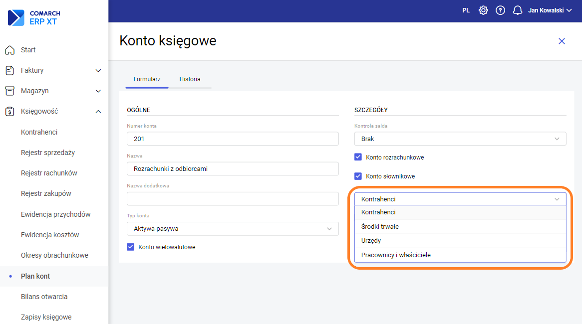Jeśli na formularzu konta księgowego zostało ono wybrane jako słownikowe użytkownik ma możliwość wyboru rodzaju podmiotów, z jakim dane konto ma być powiązane, czy mają to być Kontrahenci, Środki Trwałe, Urzędy lub Pracownicy i Właściciele.