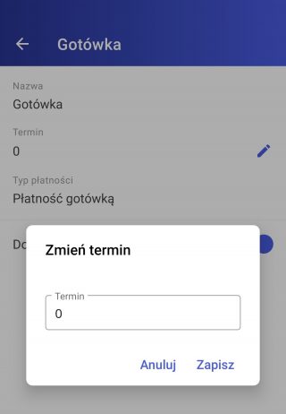 Aby zmienić domyślny termin płatności należy otworzyć wybraną pozycję, a następnie kliknąć na ikonę ołówka. W kolejnym kroku wystarczy podać odpowiednią liczbę dni i zapisać.
