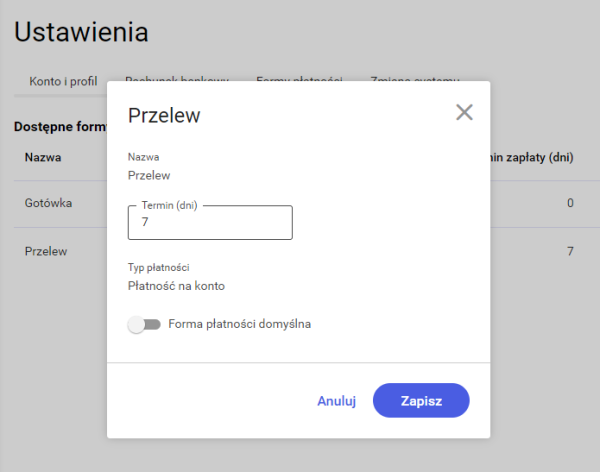 Aby zmienić domyślny termin płatności należy otworzyć wybraną pozycję ikoną ołówka, a następnie podać odpowiednią liczbę dni i zapisać.