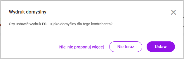 Wybranie opcji Ustaw spowoduje, że szablon zostanie zapamiętany jako domyślny i od tej pory będzie proponowany zawsze przy wydruku dokumentu dla tego kontrahenta.