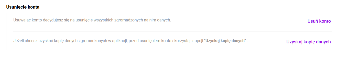 Zgodnie z unijnym rozporządzeniem „Data Act” (Rozporządzenie Parlamentu Europejskiego i Rady (UE) 2023/2854), które weszło w życie 12 września 2025 r., przed usunięciem konta użytkownik może zawnioskować o uzyskanie kopii swoich danych.