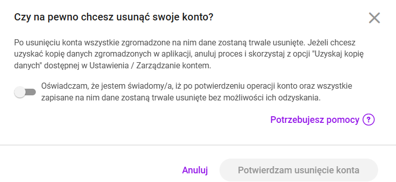 Konto jest usuwane bezpośrednio po potwierdzeniu, a Użytkownik zostanie automatycznie wylogowany z konta.