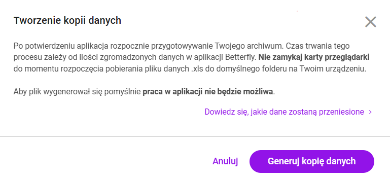 - Złóż wniosek o kopię danych: Jeśli chcesz uzyskać kopię swoich danych, musisz złożyć wniosek o jej utworzenie, korzystając z opcji Uzyskaj kopię danych. Kopia zostanie przekazana w ciągu kilku dni w postaci pliku excel. Informację o tym, jakie dane są zapisywane w arkuszu znajdziesz tutaj: