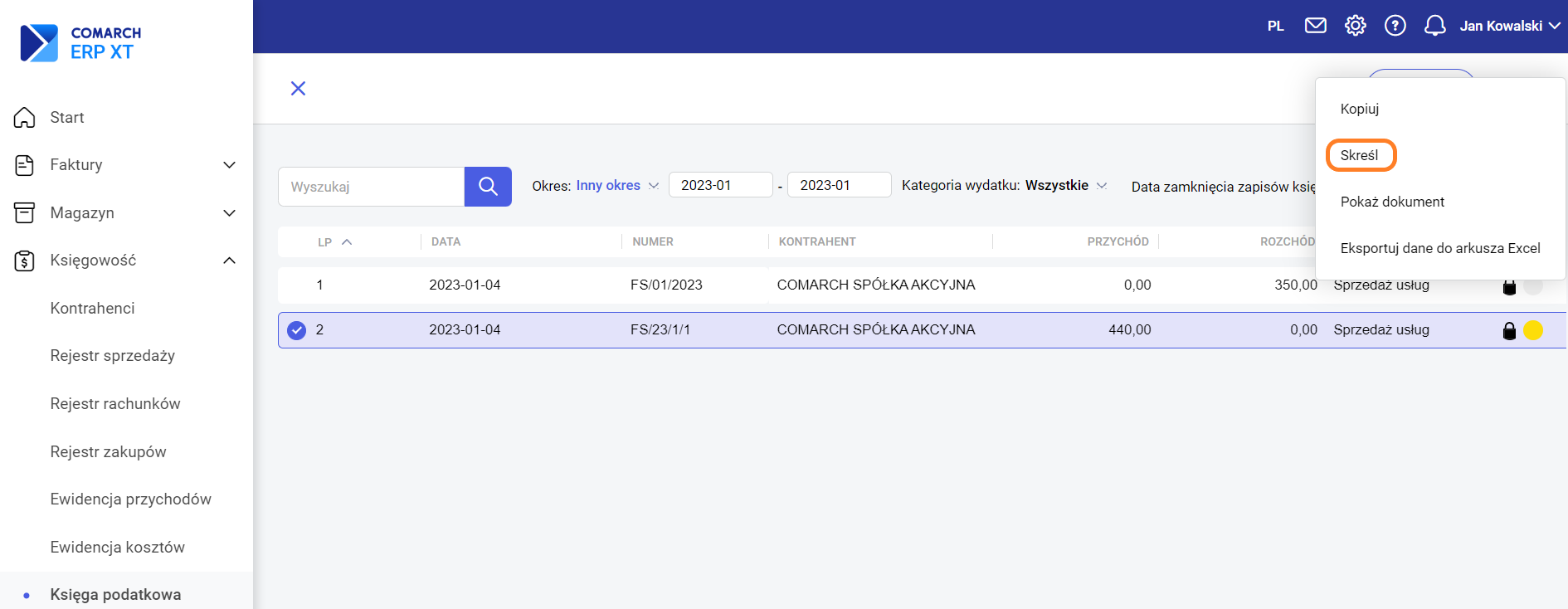 W przypadku, gdy zapis zostanie zatwierdzony (zapis ma symbol zamkniętej kłódki), nie ma możliwości usunięcia, można natomiast skreślić taką pozycję zaznaczając dokument, a następnie z menu kontekstowego wybrać Skreśl. Zapis taki będzie widoczny na wydruku jako zapis przekreślony. Skreślony zapis nie jest brany pod uwagę w podsumowaniach.