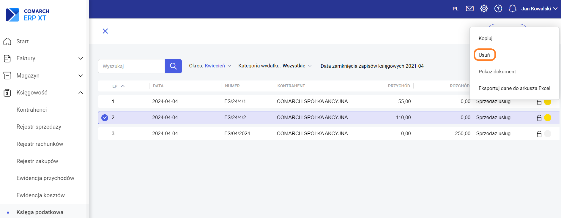Jeżeli pozycja znajduje się w otwartym okresie (zapis posiada symbol otwartej kłódki), to taki zapis możemy usunąć. Po zaznaczeniu w menu kontekstowym znajduje się opcja Usuń.