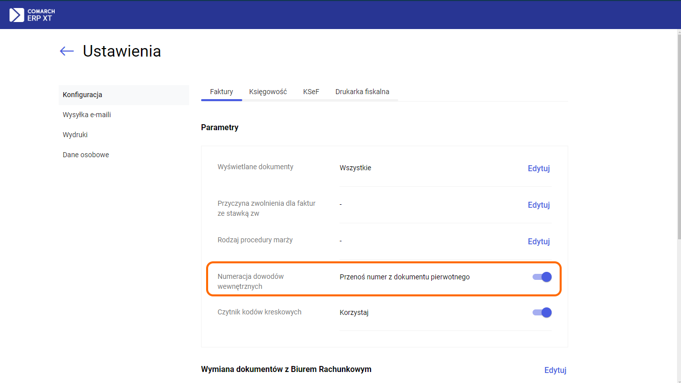 Dodatkowo w Konfiguracji w zakładce Faktury został dodany parametr „Przenoś numer z dokumentu pierwotnego na dowody wewnętrzne”. Parametr będzie domyślnie zaznaczony. Jeżeli Użytkownik zaznaczy parametr to na dowody wewnętrzne będzie przenoszony numer z dokumentu pierwotnego.