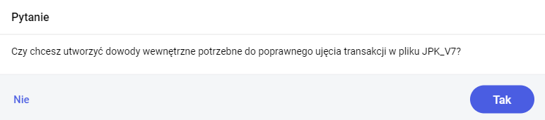 - W rejestrze VAT zakupów po wskazaniu kontrahenta krajowego (podatnik VAT czynny), wewnątrzunijnego lub pozaunijnego, stawki VAT nie podlega lub stawki 0% oraz w kolumnie Pole w JPK_V7 opcji Nie uwzględniaj w pliku JPK_V7, podczas zapisu dokumentu pojawi się analogiczne pytanie dotyczące utworzenia dowodów wewnętrznych.