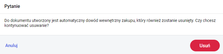 Na liście w Rejestrze VAT sprzedaży oraz w Rejestrze VAT zakupów została dodana dodatkowa opcja w filtrze Status: Bez dowodów wewnętrznych, która będzie pokazywała te dokumenty, które kwalifikują się do wystawienia automatycznych dowodów wewnętrznych, ale nie mają ich utworzonych. W przypadku zaznaczenia na liście dokumentu, który kwalifikuje się do utworzenia automatycznych dowodów wewnętrznych, a takich dowodów nie ma utworzonych, w menu kontekstowym do tego dokumentu jest możliwość utworzenia takich dowodów. Przy próbie usunięcia automatycznego dowodu wewnętrznego sprzedaży, do którego został utworzony automatyczny dowód wewnętrzny zakupu pojawi się komunikat: Wybór opcji Usuń spowoduje, że usunięty zostanie również dowód wewnętrzny zakupu. Po wybraniu opcji Anuluj widok powróci na listę dokumentów w Rejestrze VAT sprzedaży. W przypadku edycji automatycznego dowodu wewnętrznego sprzedaży, do którego istnieje wewnętrzny dowód zakupu podczas zapisu pojawi się komunikat: W programie istnieje możliwość wydrukowania dowodów wewnętrznych z poziomu formularza dokumentu oraz z listy dokumentów w rejestrze VAT zakupów i rejestrze VAT sprzedaży, po zaznaczeniu i wybraniu opcji Drukuj w prawym górnym rogu.