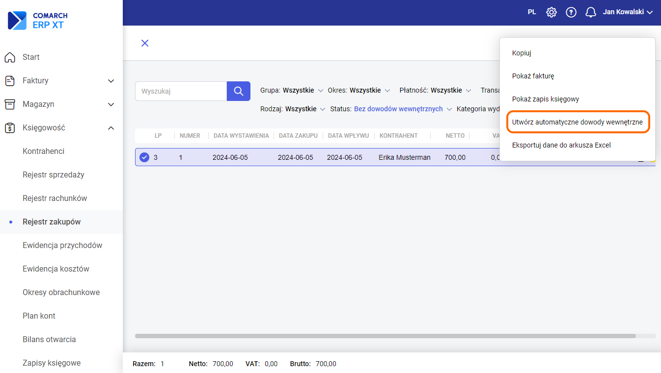 Wybór opcji Tak spowoduje utworzenie dowodu wewnętrznego w rejestrze VAT zakupów i w rejestrze VAT sprzedaży ze stawką 23% oraz ustawionym odpowiednim polem w JPK_V7 (według standardowego mechanizmu kwalifikowania według stawki VAT oraz rodzaju transakcji). Po wyborze opcji Nie dowody wewnętrzne nie utworzą się, a zapis w rejestrze VAT zakupów zostanie zapisany i zaksięgowany.
