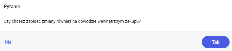 Wybór opcji TAK spowoduje zapis zmian również na dowodzie wewnętrznym zakupu. Analogiczna sytuacja wystąpi podczas edycji i zapisu dowodu wewnętrznego zakupu.