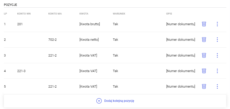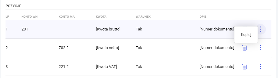 Informacja o warunku na pozycji schematu księgowego jest również prezentowana w tooltipie kolumny Warunek. W polu Opis można wskazać, jakie informacje będą zapisywane podczas automatycznego księgowania wybranym schematem – np. w nagłówku zapisu księgowego może pojawiać się numer dokumentu. Ostatnią sekcją formularza są Pozycje, gdzie należy określić: Po kliknięciu w wybraną pozycje wyświetli się pełny formularz, gdzie widoczne będą wszystkie opisywane powyżej opcje: Na schemacie księgowym jest możliwe kopiowanie pozycji wewnątrz schematu: Podczas zapisywania nowego schematu księgowego system zapyta Użytkownika, czy za jego pomocą chce wykonywać automatyczne księgowanie. Wybór odpowiedzi „TAK” będzie skutkował tym, że od tego momentu dokumenty określone w schemacie będą nim automatycznie księgowane. Jeżeli schemat księgowy został już użyty, wtedy nie ma możliwości jego usunięcia, jest natomiast możliwość jego modyfikacji.