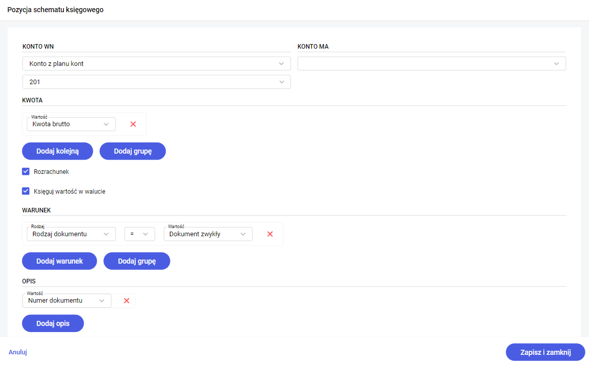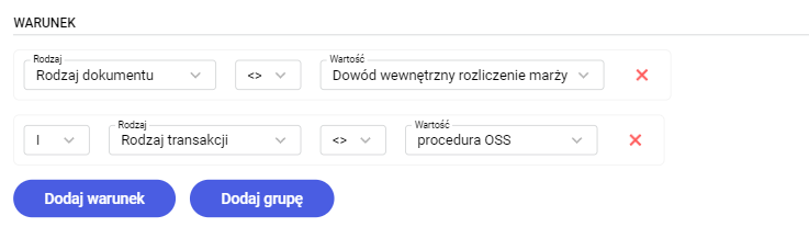 W kolejnej sekcji można określić Warunki, kiedy dany schemat będzie miał zastosowanie – np. dla konkretnej waluty, podmiotu lub rodzaju dokumentu. Bardziej skomplikowane warunki można układać w grupy.