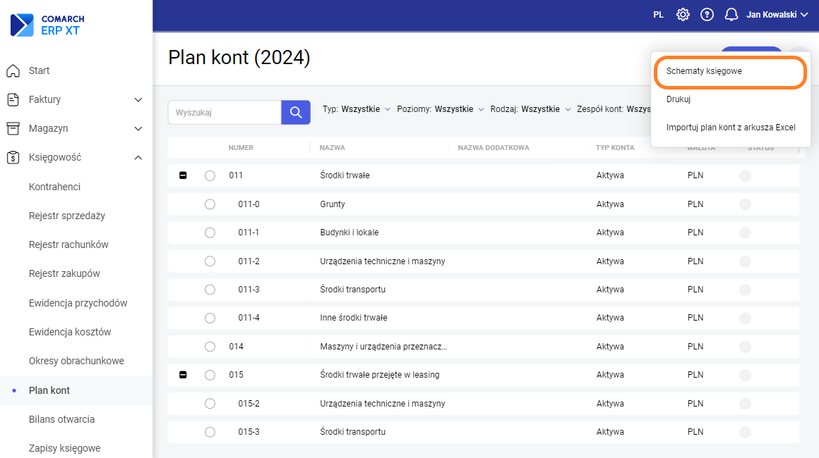 Schematy te można modyfikować, jeśli jest potrzeba dostosowania do specyfiki działalności. Można także tworzyć własne. Edycja schematów jest dostępna z poziomu okna Plan kont w menu kontekstowym.