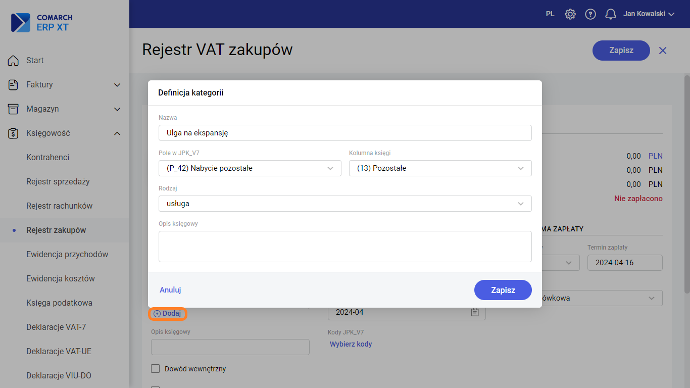 Poniższy przykład jest opisem stworzenia spersonalizowanej kategorii w Rejestrze zakupów. Tworzenie nowej kategorii na pozostałych listach odbywa się w ten sam sposób.