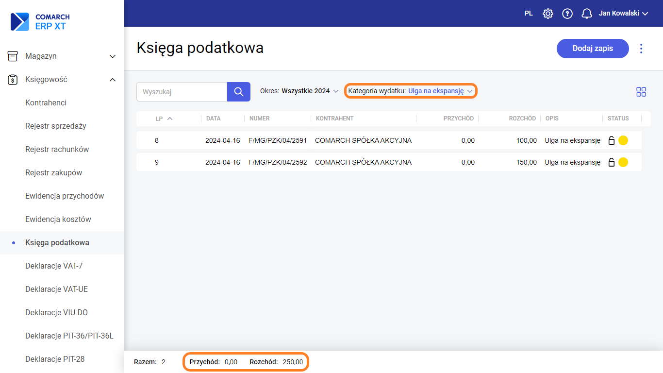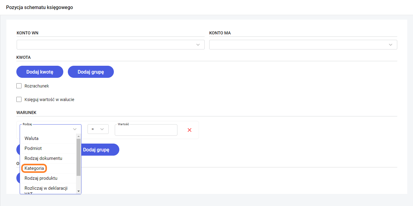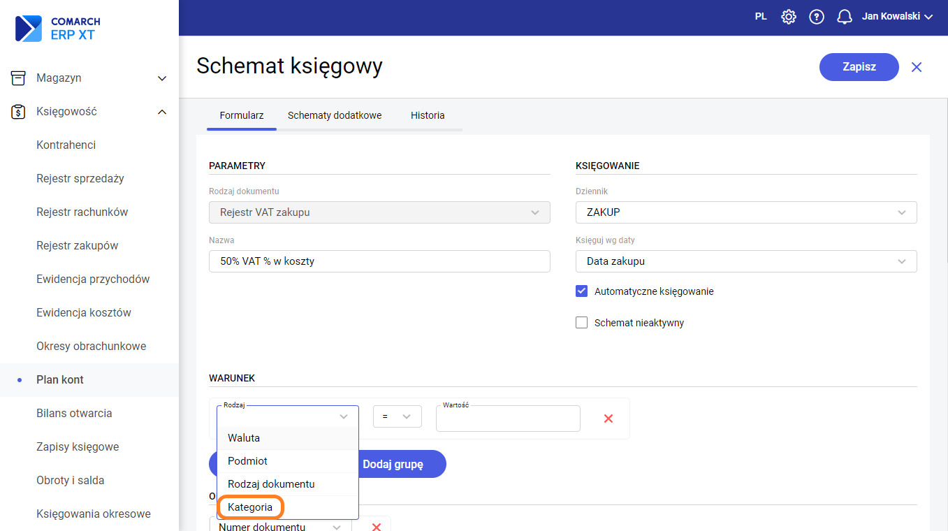 Po uzupełnieniu pól i zapisie, Kategoria wydatku zostaje utworzona i widoczna na liście. Krok trzeci- uzupełniamy pozostałe pola związane z zapisem w rejestrze VAT zakupów. Dokument zapisujemy. W przypadku rodzaju księgowości „Księga podatkowa” wskazana kategoria jest przenoszona na zapis księgowy dla zapisów z datą od 01.01.2022. Spersonalizowana Kategoria wydatku dla dokumentów kosztowych jest widoczna i możliwa do wyboru: Dotychczasowe przeznaczenie kategorii wydatku nie ulega zmianie. Aby uprościć użytkownikowi wyodrębnienie kosztów, uwzględnionych w kategoriach wydatków w Księdze podatkowej, Rejestrze VAT zakupu oraz Ewidencji kosztów udostępniona została możliwość filtrowania dokumentów po danej Kategorii. Funkcjonalność zawiera domyślne oraz nowo stworzone kategorie. Taka analiza ewidencji kosztów z odpowiednim przypisaniem ich do wytwarzanych produktów w czytelny sposób pozwoli pozyskać niezbędne dane do odliczenia przewidzianej ulgi. Użytkownicy korzystający z Księgi Handlowej mają możliwość ujęcia 'Kategorii wydatku’ na schemacie księgowym dotyczącym rejestru VAT zakupu oraz ewidencji kosztów. Jest to możliwe przy tworzeniu nowego schematu oraz edycji istniejących. W polu Warunku w nagłówku oraz na pozycji schematu opcję 'Kategorię wydatku’ można wybrać z rozwijanej listy. Po wybraniu kategorii z listy- danym schematem/ pozycją schematu księgowane są tylko te dokumenty, które mają wskazaną daną kategorię.