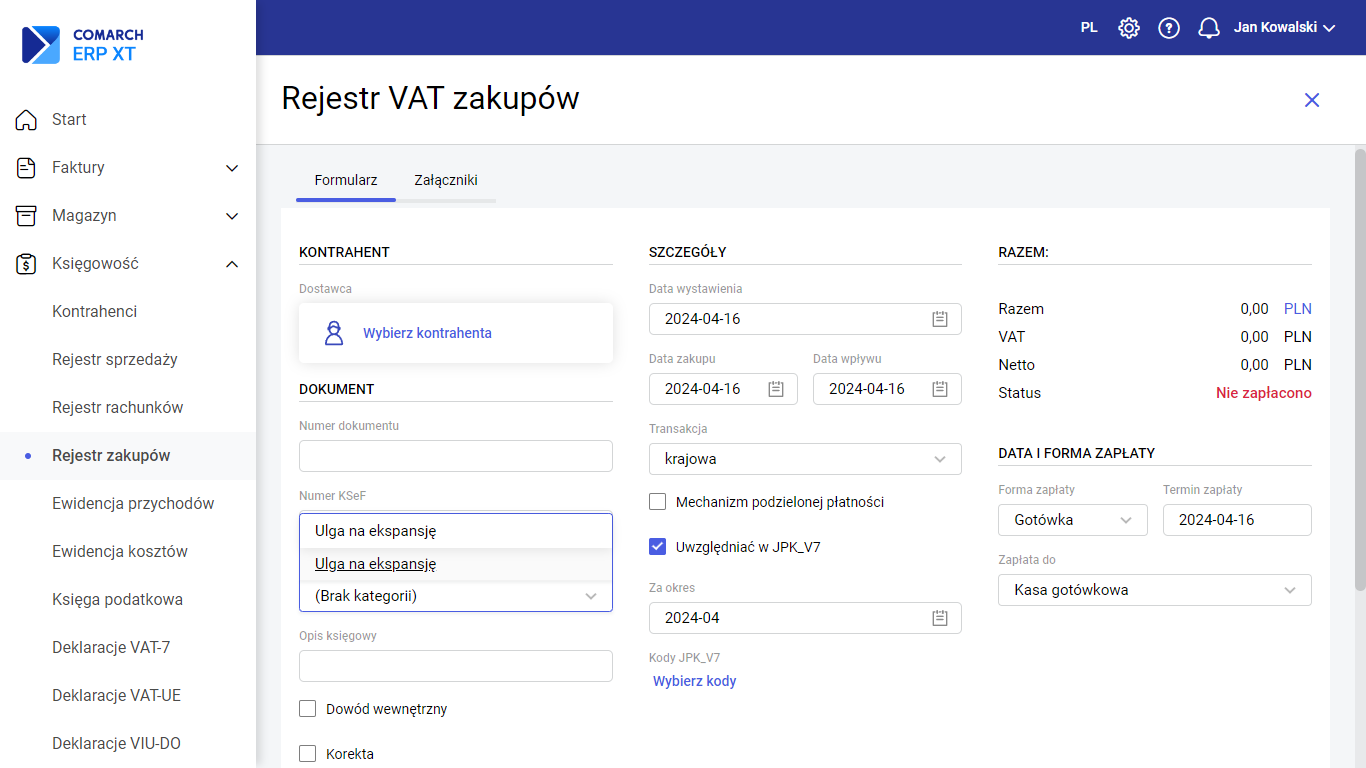 Krok pierwszy– wybieramy Księgowość >>> Rejestr zakupów i dodajemy nowy dokument.