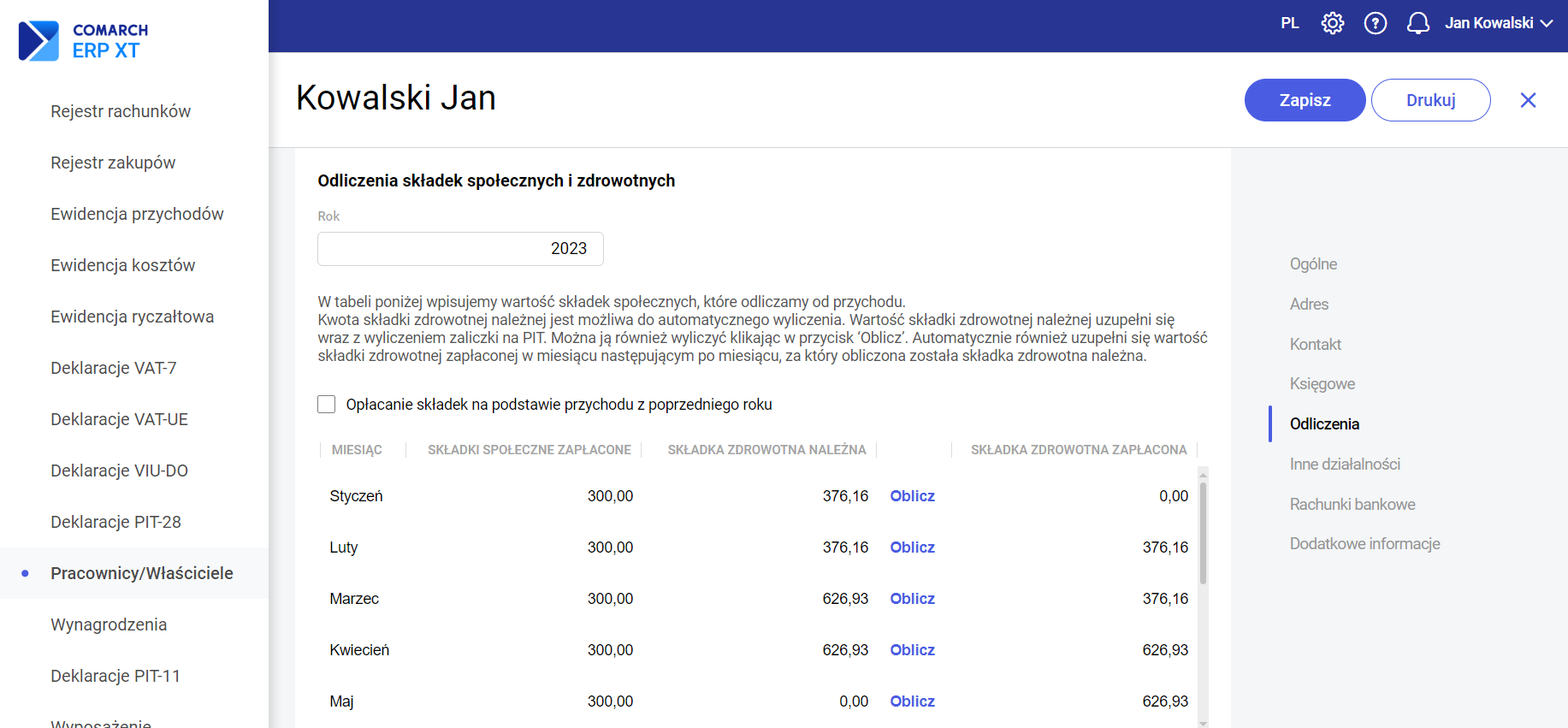 Odliczenia składek społecznych – użytkownik może wprowadzić dla poszczególnych miesięcy wartości składek społecznych odliczanych od sumy przychodów.