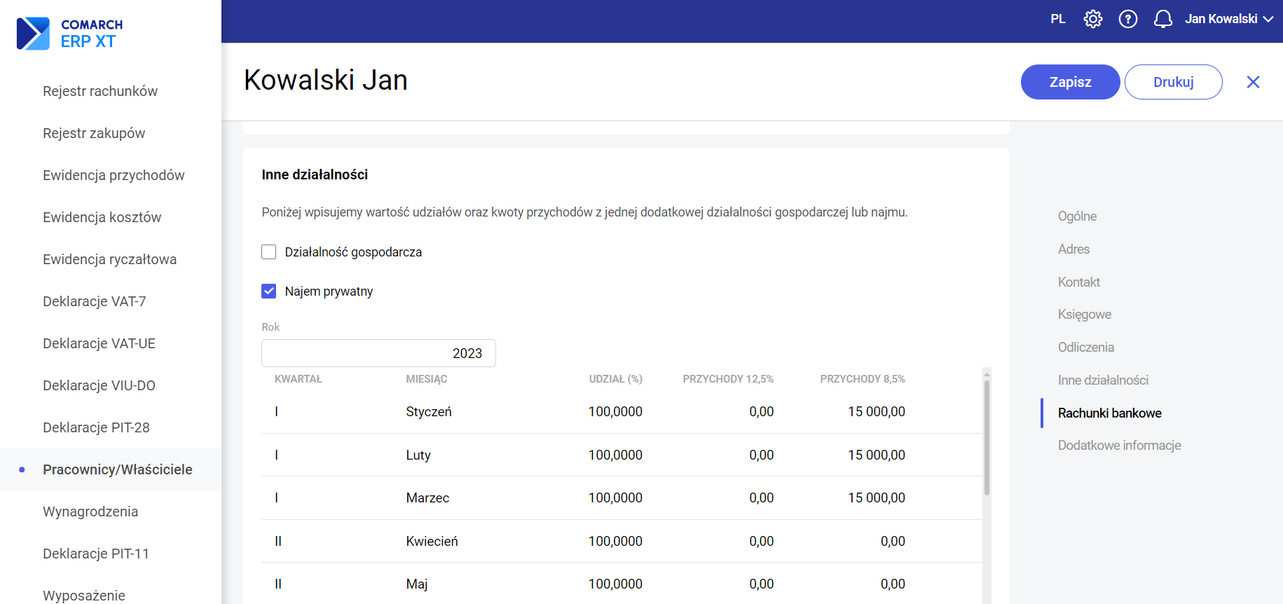 W sekcji Inne działalności jest możliwość wskazania dodatkowych działalności właściciela: Działalność gospodarcza oraz Najem. Po zaznaczeniu odpowiedniego parametru pokaże się tabela, w której będzie możliwe uzupełnienie dla poszczególnych miesięcy kwoty przychodów według odpowiedniej stawki ryczałtu.