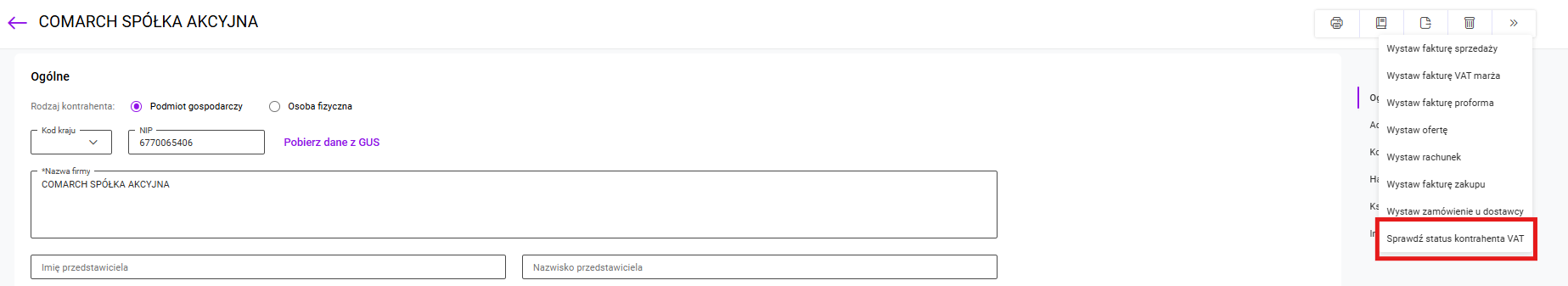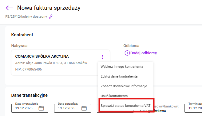 4. Podczas dodawania nowego dokumentu na pozostałych listach po dodaniu kontrahenta istnieje możliwość sprawdzenia jego statusu klikając w menu pod 3 kropkami obok kontrahenta i wybierając opcję Sprawdź status kontrahenta VAT: