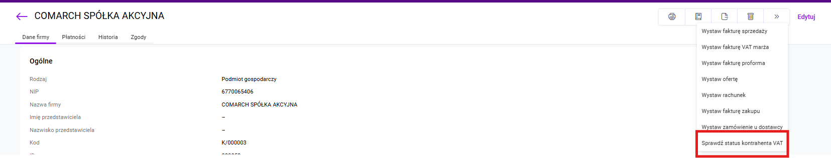 2. Podczas edycji karty istniejącego już kontrahenta istnieje możliwość sprawdzenia statusu kontrahenta VAT klikając w opcję Sprawdź status kontrahenta VAT: