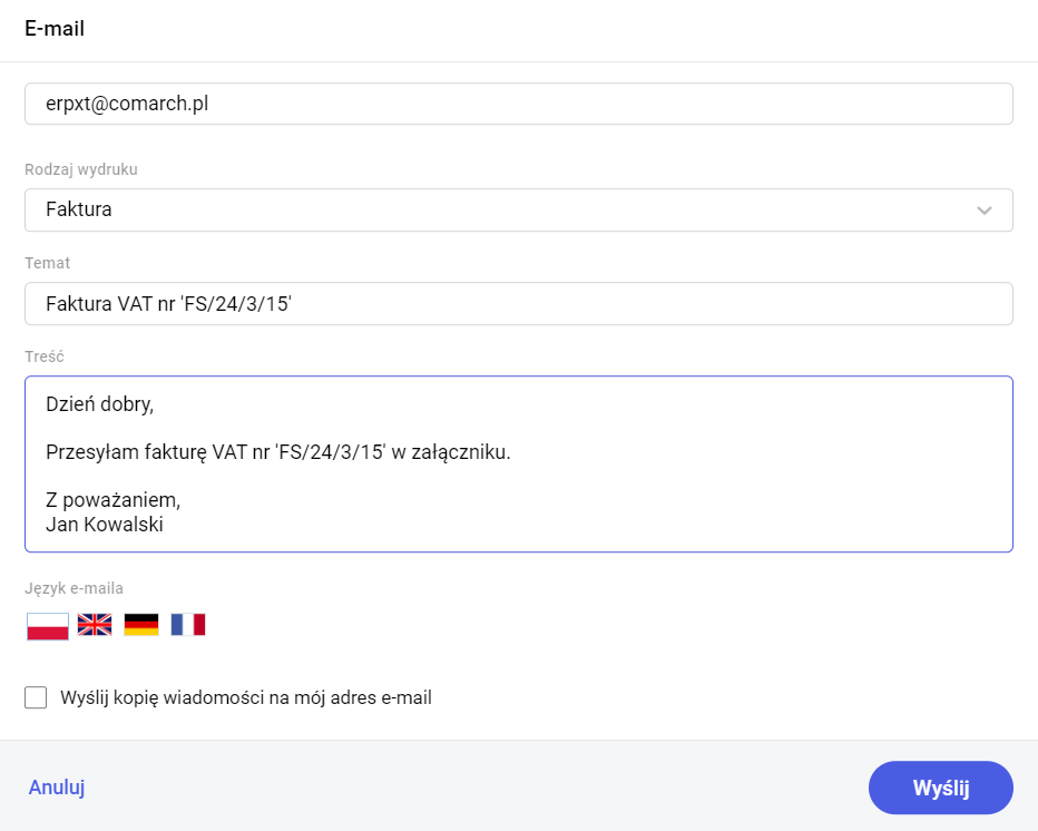Jeśli na karcie adres nie jest uzupełniony, ale wprowadzimy go podczas wysyłania maila do kontrahenta, zostanie automatycznie uzupełniony również na jego karcie. Dzięki temu będzie proponowany podczas każdej kolejnej wysyłki.