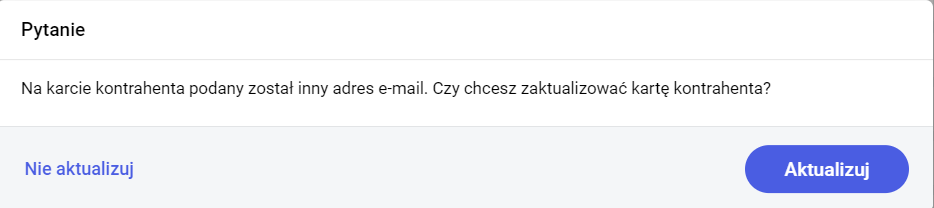 Jeśli adres kontrahenta uległ zmianie wystarczy wprowadzić go podczas wysyłania maila. Wtedy program zapyta nas, czy zaktualizować również na karcie: