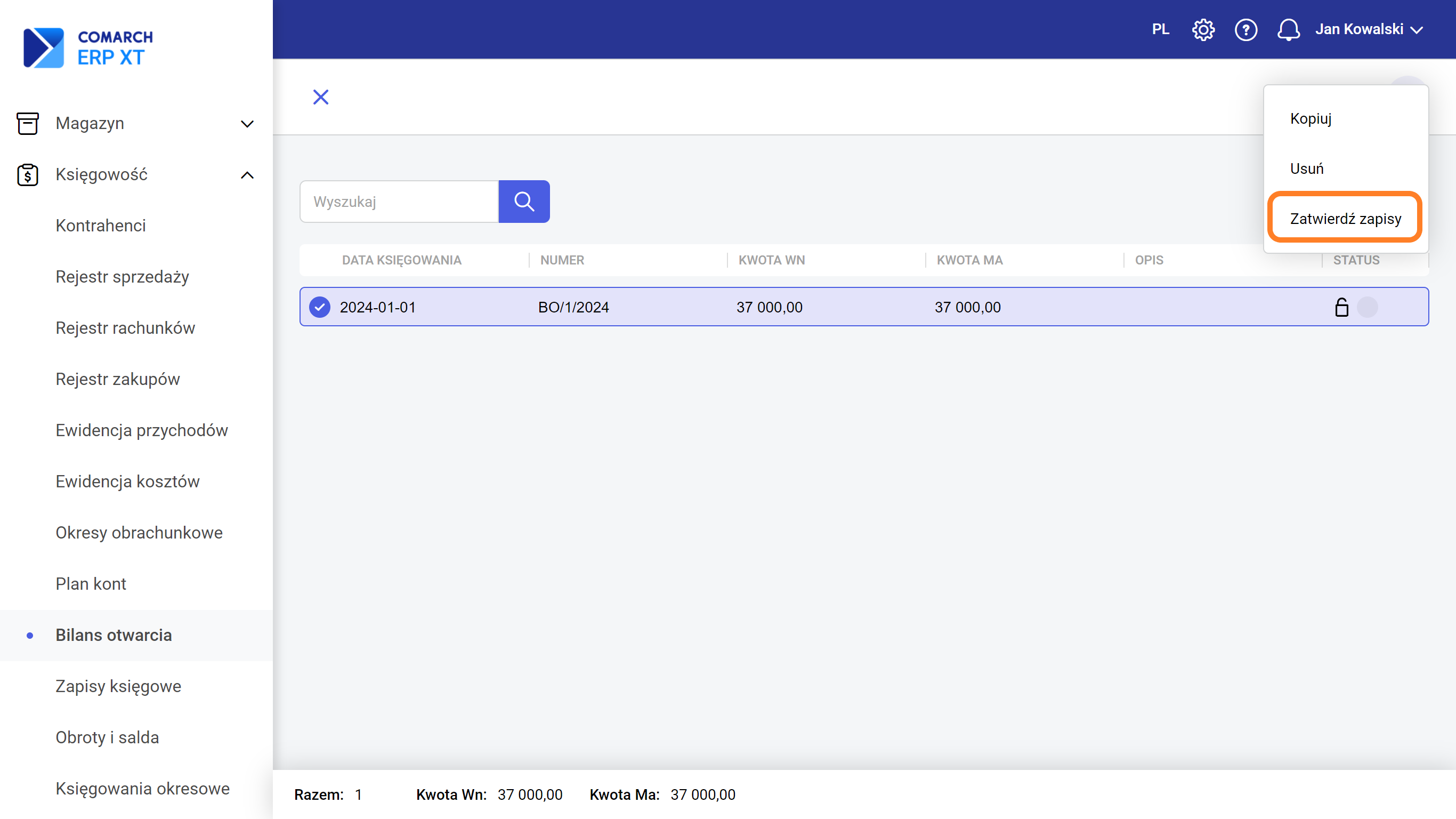 Po kliknięciu na przycisk „Zapisz” dokument bilansu otwarcia zostanie zapisany. Z menu kontekstowego dostępna jest opcja „Zatwierdź zapisy”.