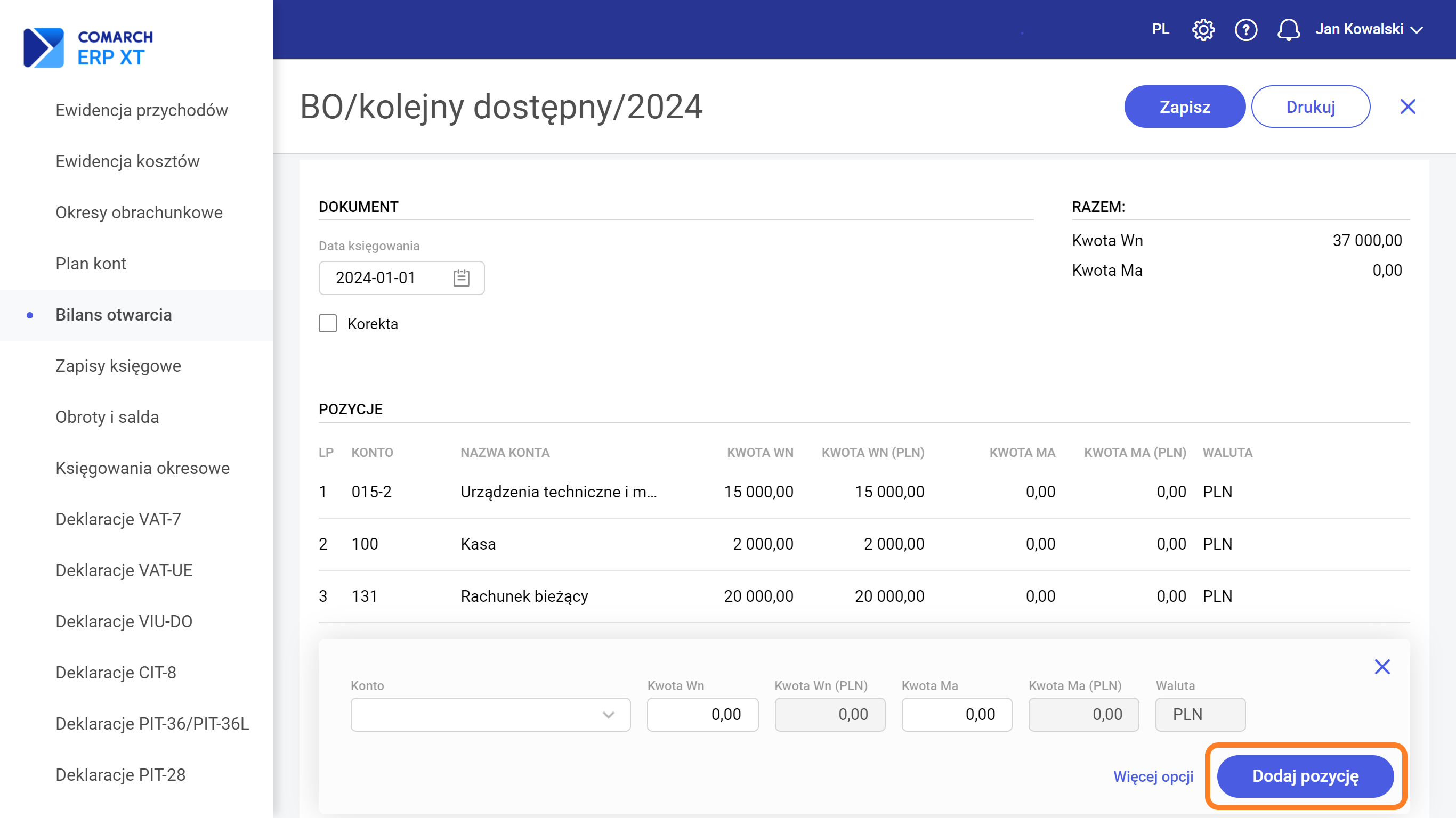 Krok drugi – pojawi się formularz, w którym należy uzupełnić poszczególne pozycje. System zaproponuje datę księgowania jako pierwszy dzień bieżącego okresu obrachunkowego. W sekcji „RAZEM” na bieżąco można analizować sumę kwot po stronie Winien i po stronie Ma.